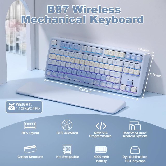 This mechanical keyboard is more than just a tool—it’s an experience. The gasket-mounted structure paired with pre-lubed linear switches ensures smooth, buttery keystrokes that reduce noise and fatigue. The 80% layout offers the ideal balance between compactness and functionality, perfect for minimal desks or gaming setups. With multi-device connectivity and a robust build, it’s ready to power through your workday, gaming sessions, and creative projects.